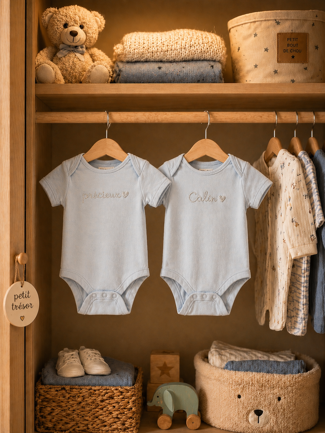 Lot de 2 body bébé brodés – “Précieux” & “Câlin”